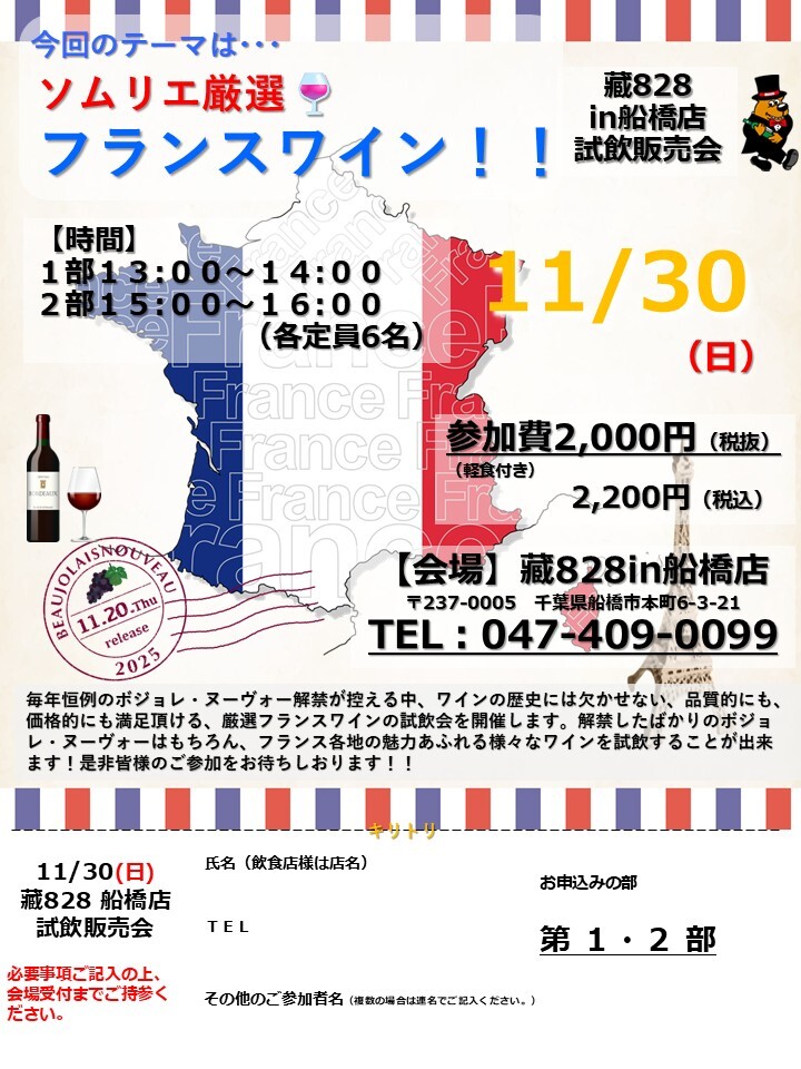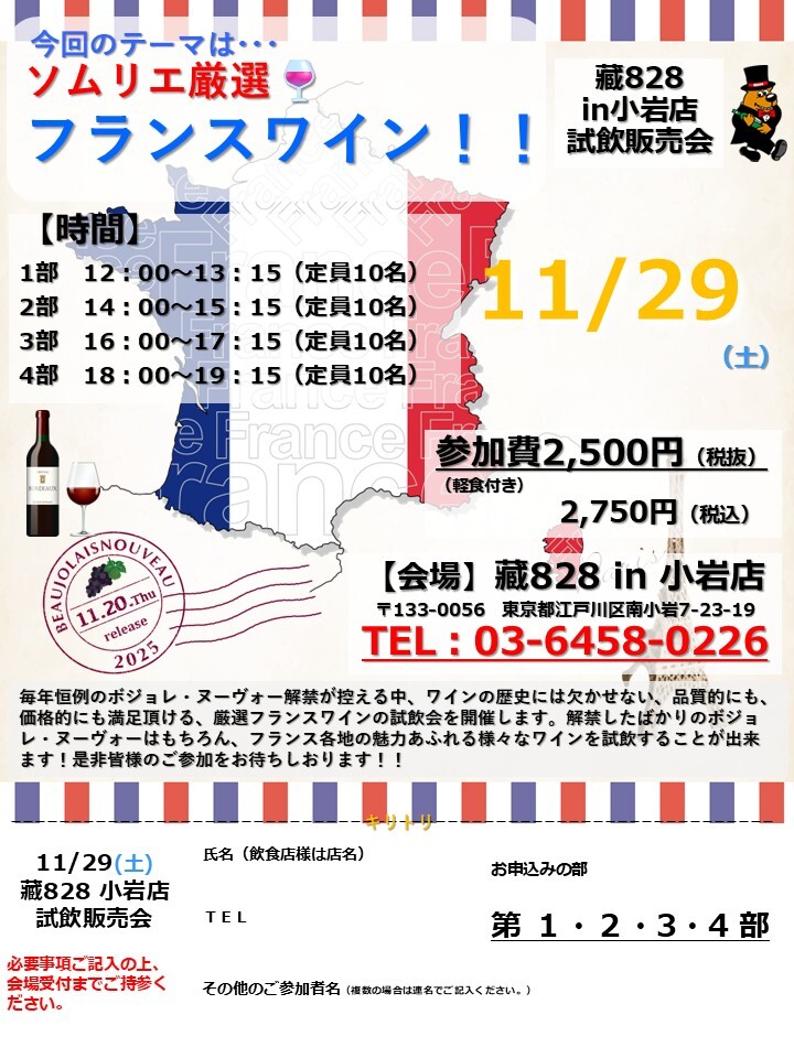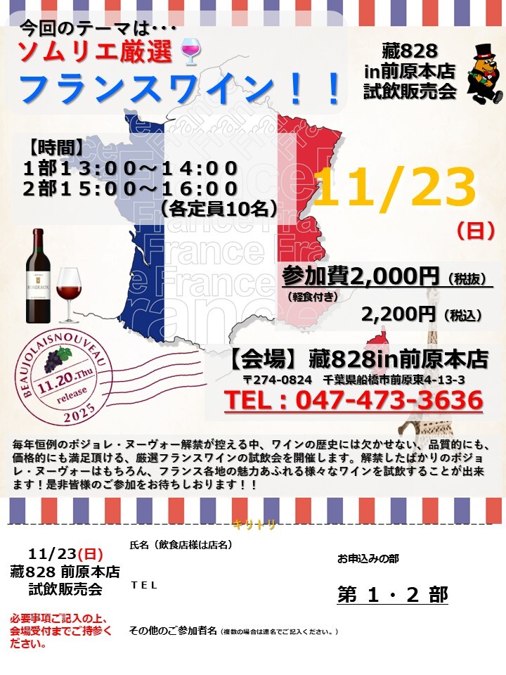 藏828(前原本店・小岩店・船橋店)3店舗にて、ワイン試飲販売会を開催いたします!